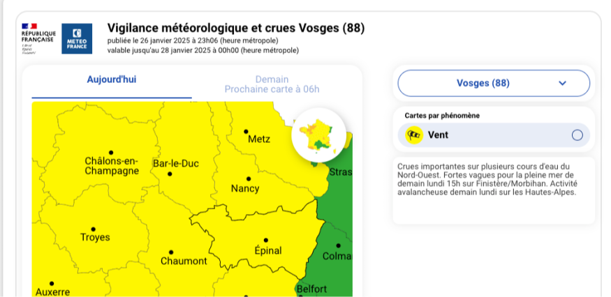 Retrouvez la carte de vigilance ici : https://vigilance.meteofrance.fr/fr/vosges
