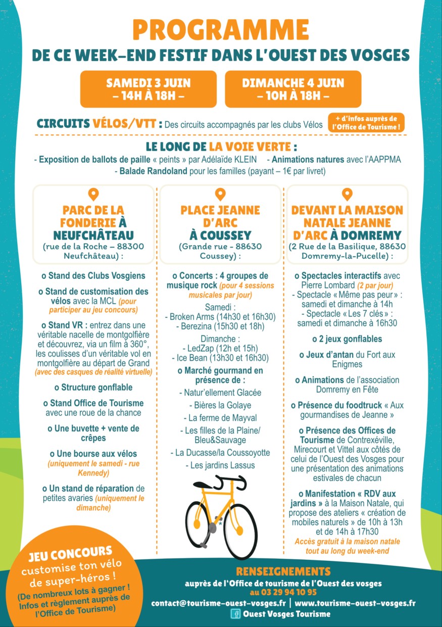 Christelle Vélut, directrice de l'office de tourisme de l'ouest des Vosges, vous invite ces 3 et 4 juin à Neufchâteau, Coussey et Domrémy! A l'occasion de l'ouverture de la nouvelle voie verte, profitez de parcours cyclotourismes. Des groupes de musique donneront des concerts. Enormément d'animations et de surprises vous attendent!