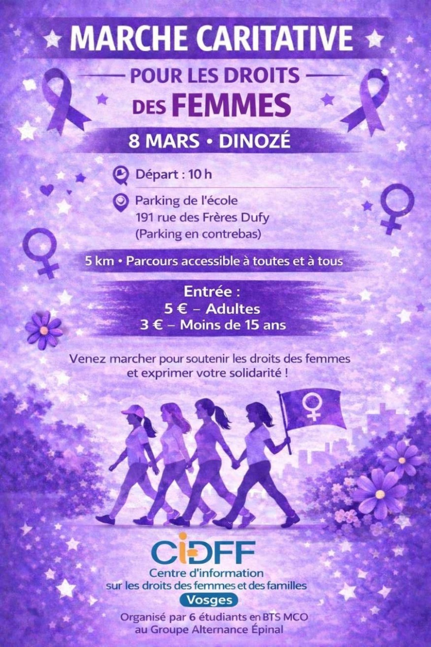 Et si vous marchiez pour la bonne cause dimanche ? A l'occasion de la Journée Internationale des Droits des Femmes, un groupe d'étudiants a monté un projet : une marche caritative. Elle se déroule ce dimanche à Dinozé. Le but ? Sensibiliser les participants mais aussi récolter des dons pour venir en aide au Centre d'Information sur les Droits des Femmes et des Familles qui oeuvrent en ce sens. On découvre le parcours de cette marche avec Romain Didot, étudiant organisateur dans les Bonnes Idées Vosges FM.