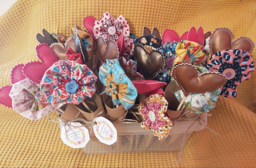 Hélène Weiss, créatrice de "Adèle et Alice" à Plombières, est passionnée de tissu. Elle fabrique des décorations et des accessoires, comme des bananes, des bouquets en tissu, des foulards, des sacs, et même des sachets de thé lavables.