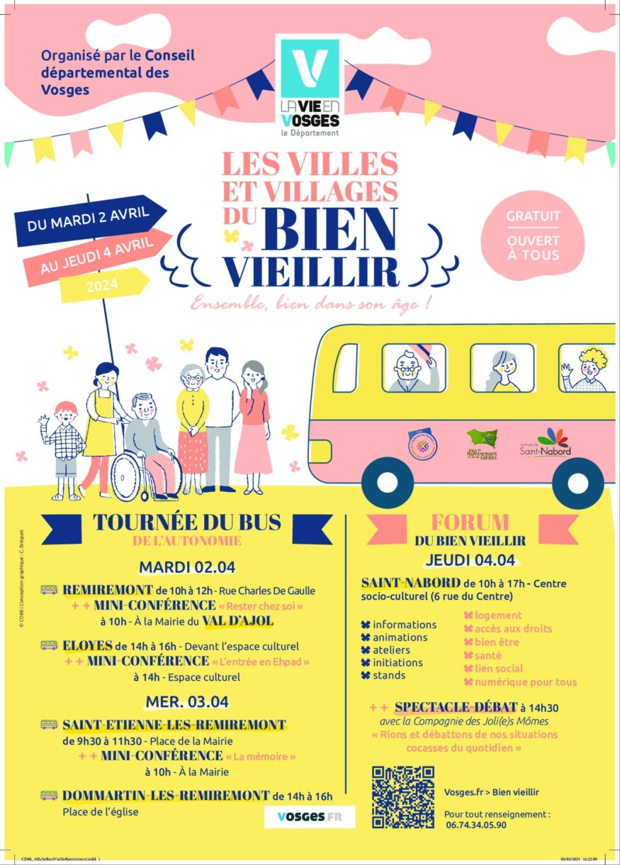 Le "forum du bien vieillir" se tiendra à Saint-Nabord le jeudi 4 avril au centre socio-culturel de 10H00 à 17H00.