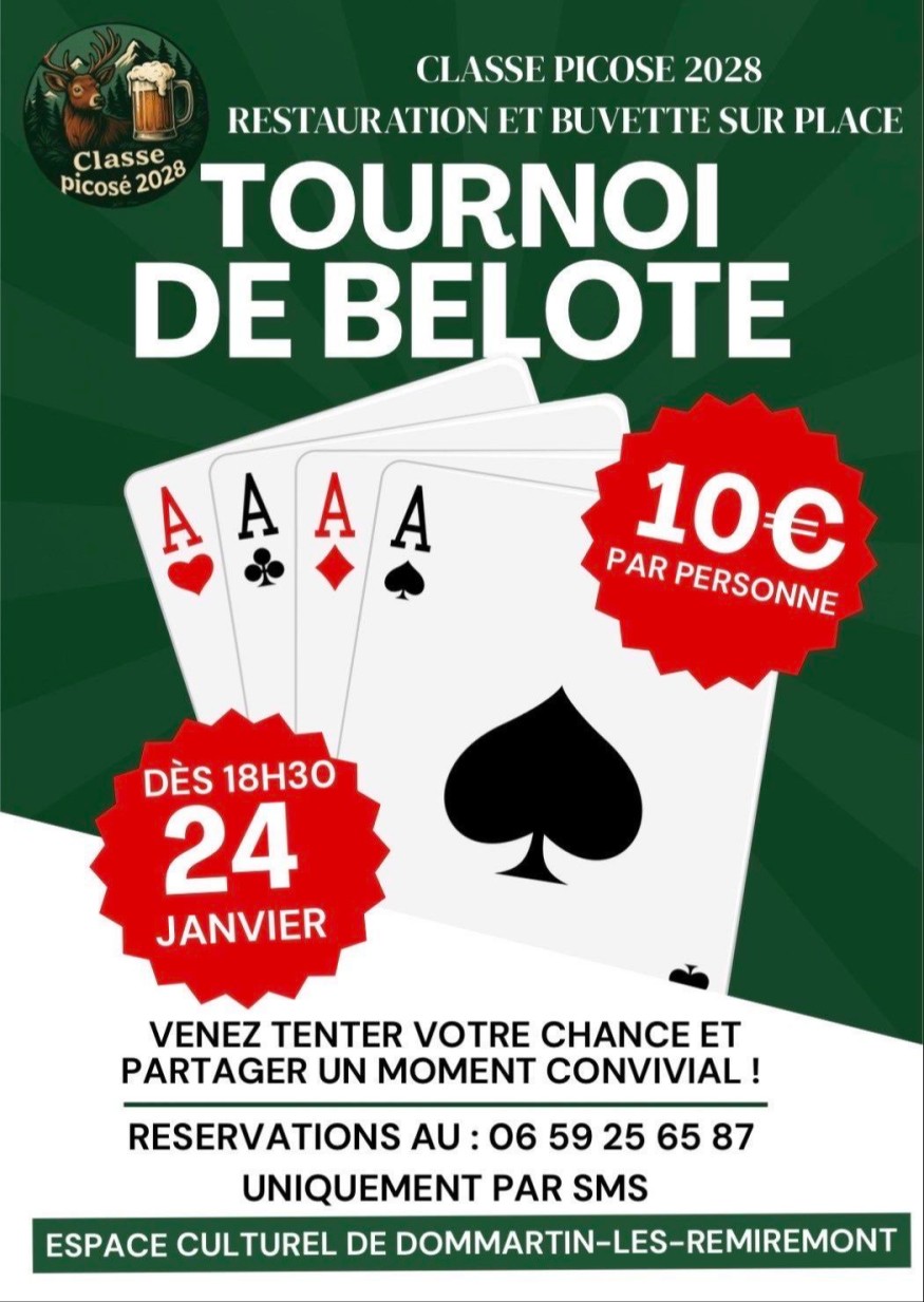 Vous êtes un as de la belote ? Rendez-vous dans ce cas samedi à Dommartin-lès-Remiremont pour un concours proposé par les conscrits ! La Classe 2028 vous attend nombreux pour une soirée conviviale. Que vous soyez pro ou débutant : n'hésitez pas à réserver ! A cette occasion, Cécile Jacquot accueille dans les Bonnes Idées Vosges FM Maxime Colin, président de la Classe 2028 des Picosés.