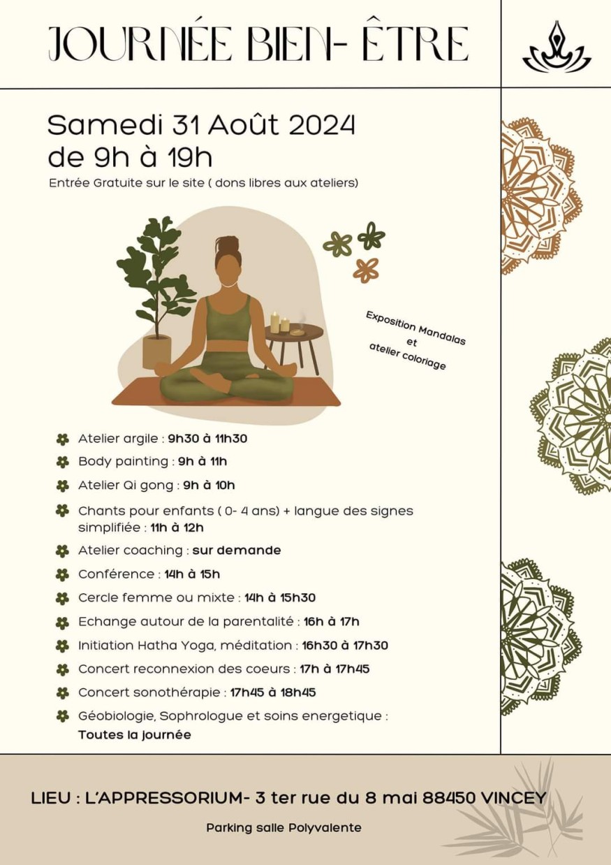 Rendez-vous à Vincey ce samedi 31 août de 9h00 à 19h00 pour cette journée bien-être! Au programme: ateliers, body painting, chants pour enfants, sophrologie, géobiologie, soins énergétiques, ... un large programme que vous présente Guillaume Hans, président de l'assocition Appressorieum, dans ce podcast.