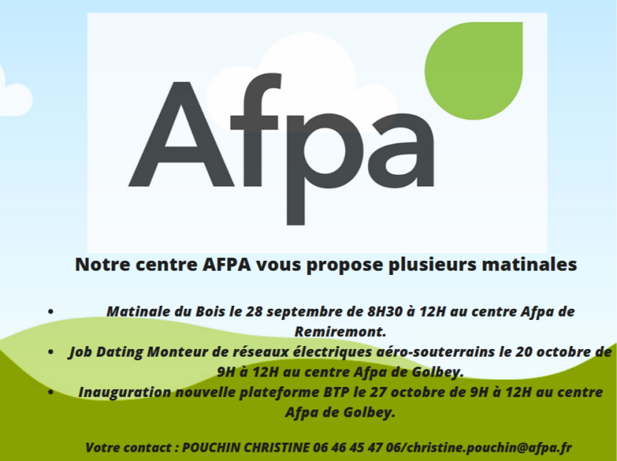 Jusqu'à la fin de l'année, Christine Pouchin, commerciale à l'AFPA (agence nationale pour la formation professionnelle des adultes) des Vosges, vous invite à participer à différentes matinales, afin de vous faire découvrir plusieurs formations.
