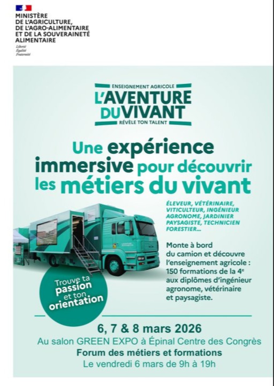 Envie de découvrir les métiers de l'agriculture, et plus largement du vivant ? Direction Epinal ce vendredi et samedi pour un événement spécial proposé par la Chambre d'Agriculture des Vosges. Tout d'abord, l'arrivée du camion "L'aventure du Vivant", mais aussi un forum dédié aux centres de formation dans le département. C'est à découvrir ce week-end au Centre des Congrès d'Epinal en marge du Salon Green Expo. Cécile Jacquot vous fait découvrir tout cela dans les Bonnes Idées Vosges FM avec Nicolas Lallemand, élu à la Chambre d'Agriculture des Vosges.