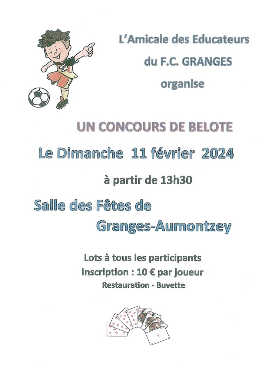 Joao Monteiro, président des éducateurs du FC Granges, vous invite à cette 24e édition du concours de belote! Rendez-vous ce dimanche 11 février à la salle des fêtes de Granges à partir de 13H30!