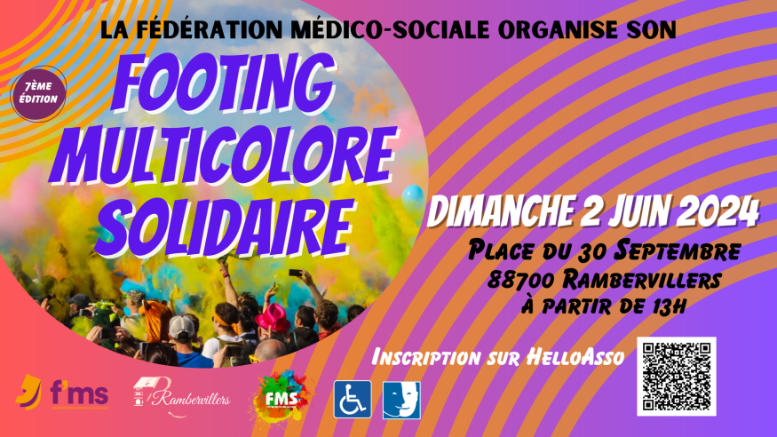 C'est parti pour la 7e édition du footing multicolore solidaire! Il se tiendra cette année à Rambervillers ce dimanche 2 juin. Venez courir ou marcher! Chaque kilomètre est marqué par un jet de poudre colorée! Vous pouvez dès maintenant vous inscrire en scannant le QR code sur l'affiche.