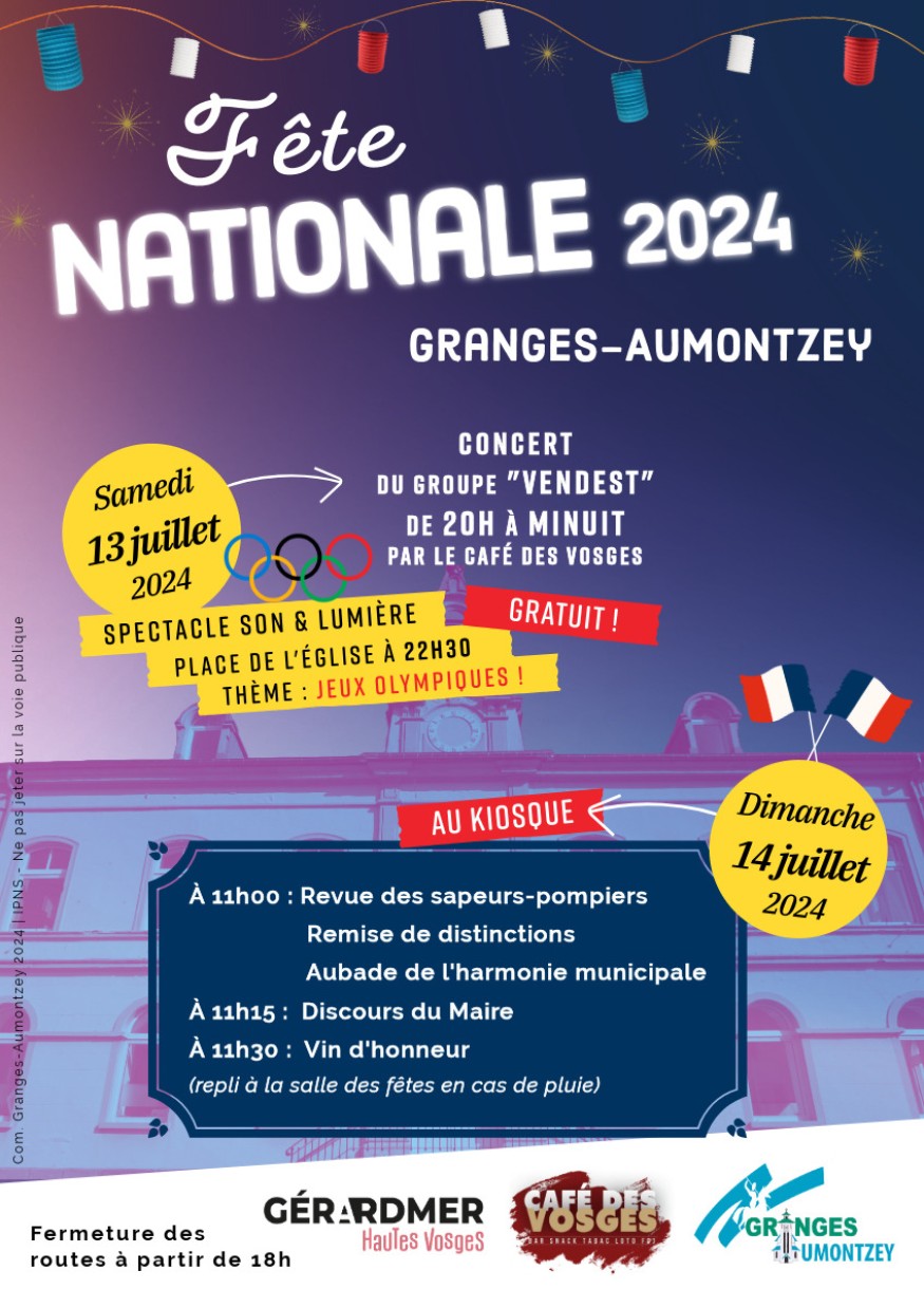 Direction Granges-Aumontzey pour le 14 juillet ! A l'occasion de la Fête nationale, la municipalité vous invite à un grand week-end de partage et de festivités. Avec un spectacle sons et lumières samedi soir aux couleurs des Jeux Olympiques. Et dimanche, un moment plus solennel.