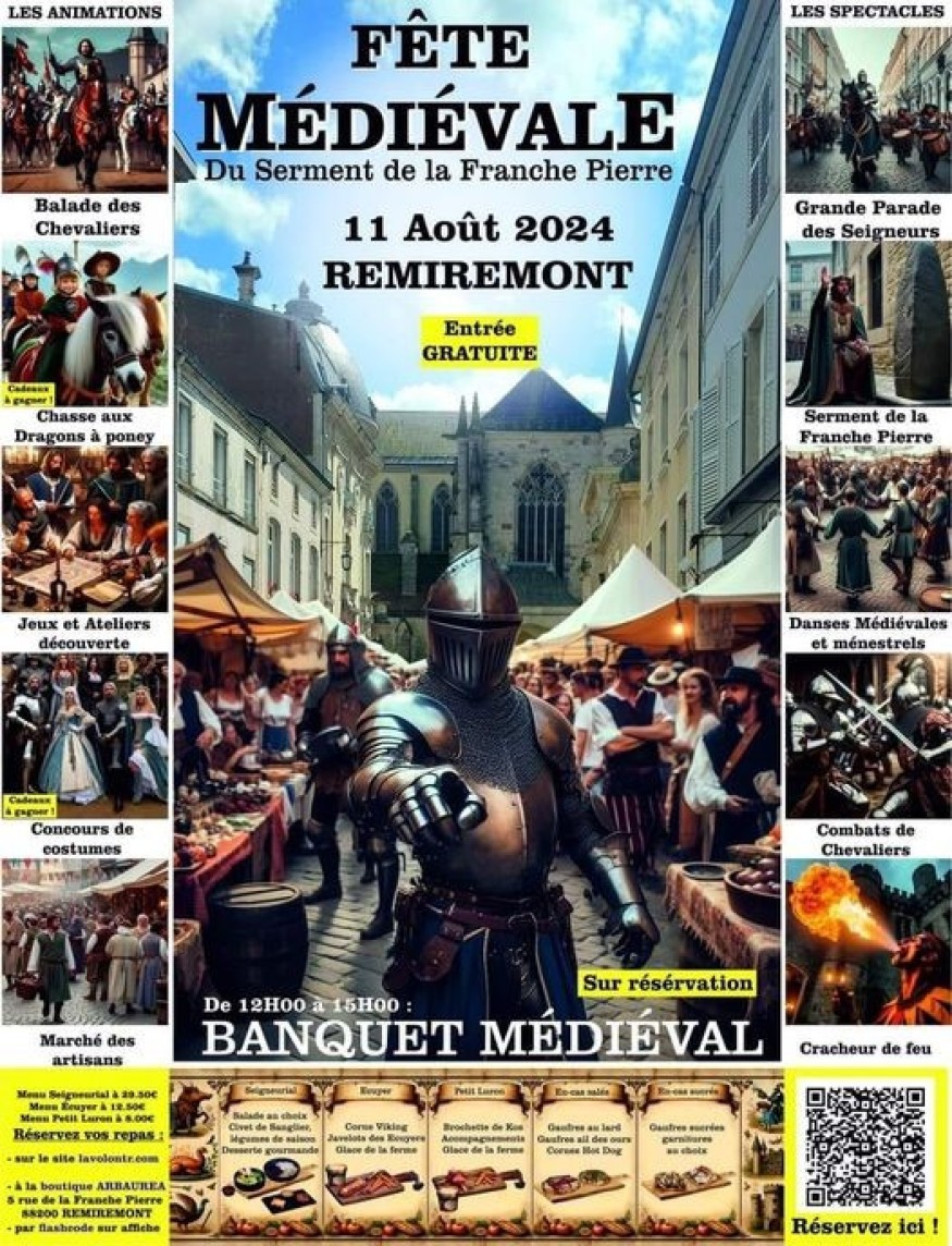 Plongez au coeur du Moyen-Age! Un marché, des ateliers et des animations, des balades à poney, des spectacles, des expositions, un concours de costumes, ... le programme s'annonce délirant ce dimanche 11 août de 10h00 à 19h00 à Remiremont!