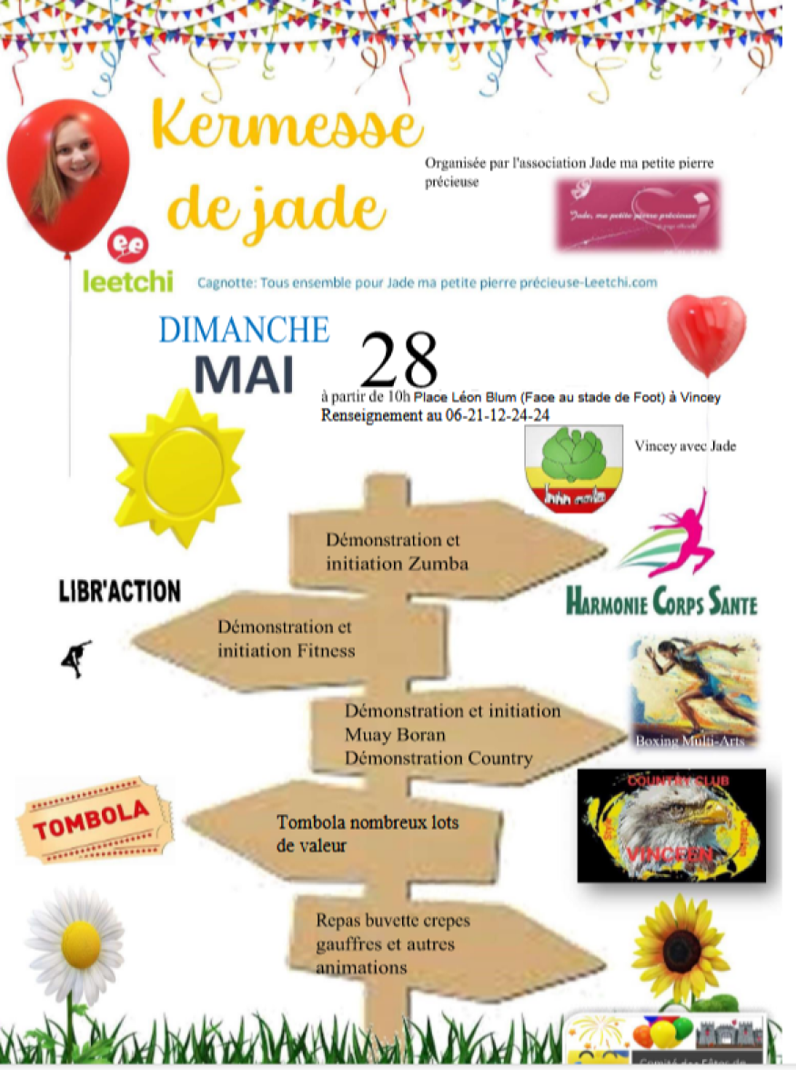 Démonstrations et initiations de zumba, de fitness, une tombola, des crêpes, des gauffres, une buvette, ... un beau programme vous attend à Vincey ce dimanche 2 mai à partir de 10H00 place Léon Blum.